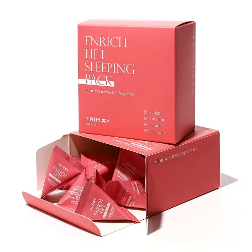 Trimay Enrich Lift Sleeping Pack is an advanced overnight lifting mask with collagen, providing intensive skin care throughout the night. The mask increases elasticity, makes the skin smooth and firm, eliminates dryness and flaking. It strengthens turgor, tightens the facial contour, and smooths wrinkles. Hydrolyzed collagen penetrates deeply into the skin, improving its structure and reducing moisture loss. The formula is enhanced with bakuchiol and idebenone, which rejuvenate the skin and combat age-related changes. The light texture of the mask is quickly absorbed, saturating the skin with moisture. Convenient portion packaging ensures hygiene and ease of use.