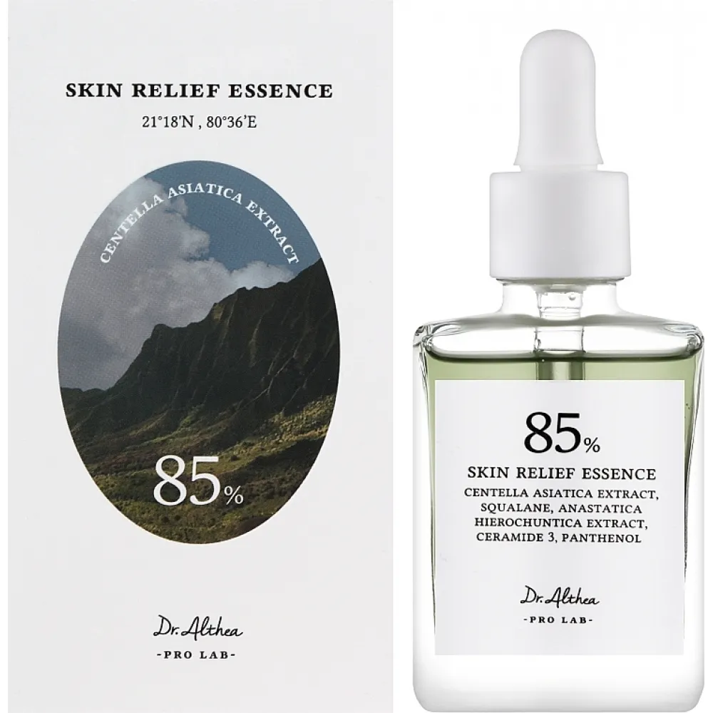 Dr. Althea - Skin Relief Essence - эссенция для лица, которая успокаивает раздражённую и чувствительную кожу. В формуле продукта используется экстракт центеллы азиатской – растительный компонент, известный своим успокаивающим действием. Он уменьшает недостатки и покраснения кожи, одновременно ускоряя её регенерацию. В состав средства также входит увлажняющая гиалуроновая кислота, аргинин и сквалан, которые восстанавливают защитный барьер, а также экстракт эдельвейса с антиоксидантным действием. Благодаря такому сочетанию кожа становится гладкой и увлажнённой. Веганский продукт в стеклянном флаконе с пипеткой.